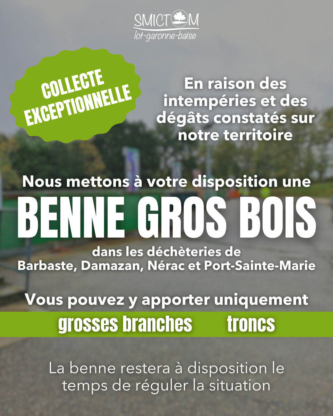 Le SMICTOM LGB vous informe qu'en raison des intempéries et des dégâts constatés sur notre territoire et pour simplifier l'évacuation des déchets générés :